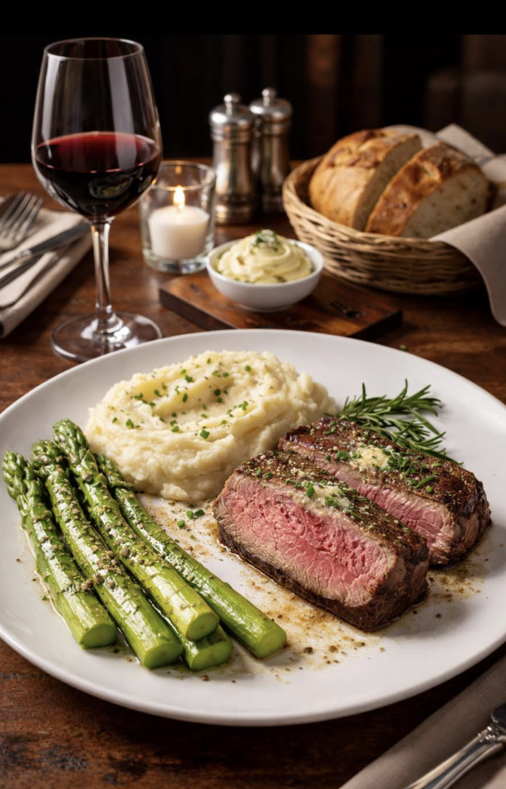 Steak cuts, Two Sides, glass of wine & sour dough bread - $47.00 pp